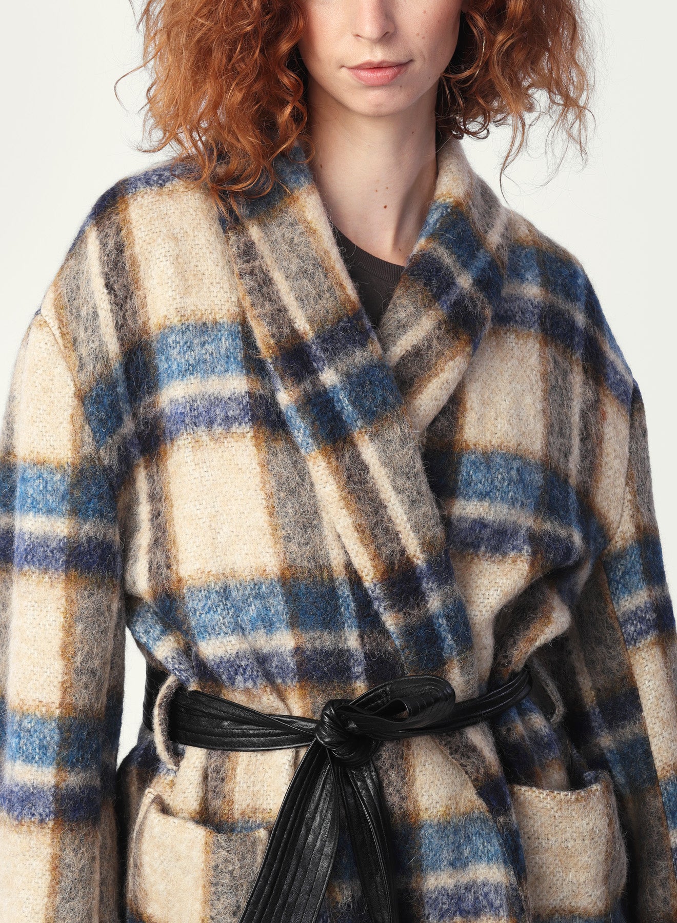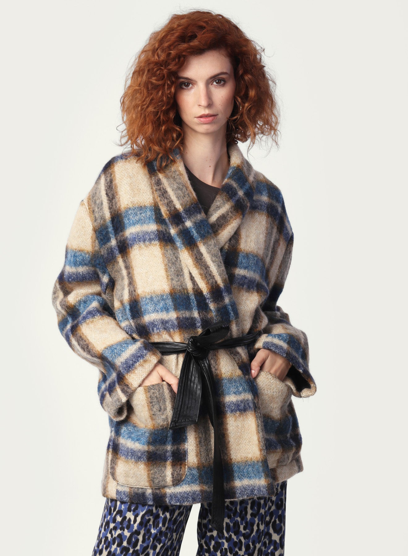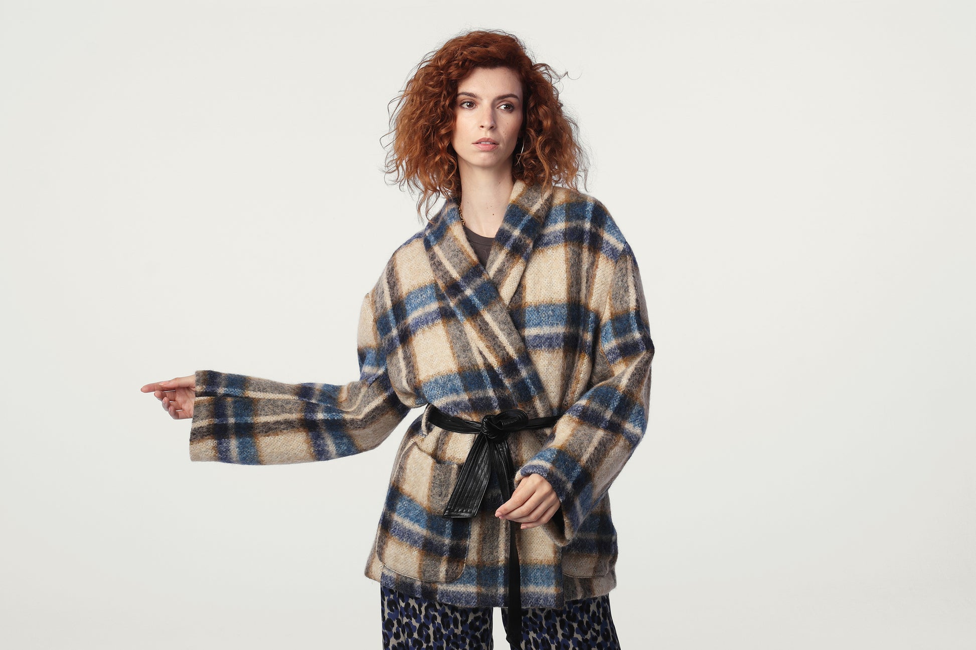Enveloppez-vous dans cette veste à col châle qui sera l'une de vos pièces préférées cette saison. Dotée d'un devant ouvert et d'une option de fermeture à nouer en similicuir, la veste à carreaux en laine West vous gardera au chaud tout en offrant un style chic et sans effort.